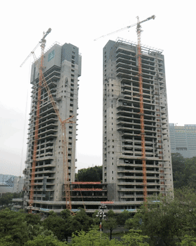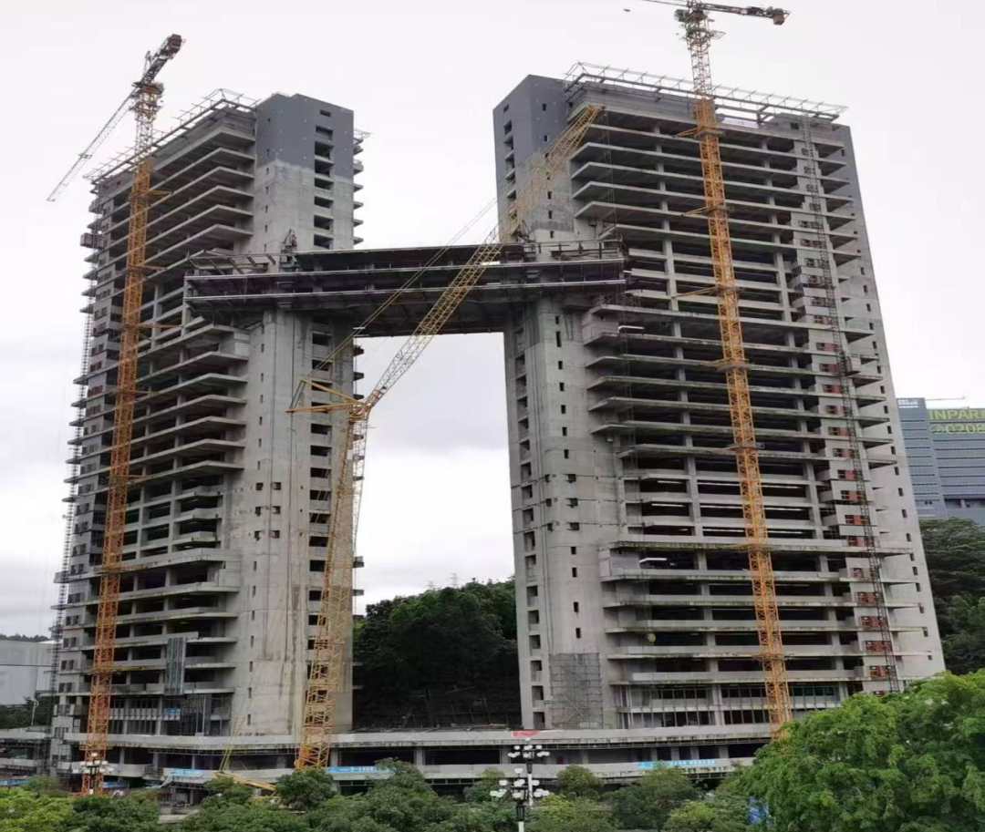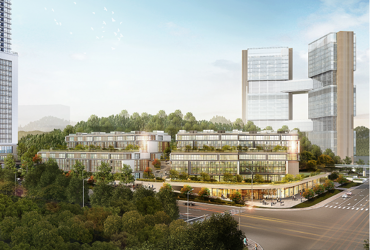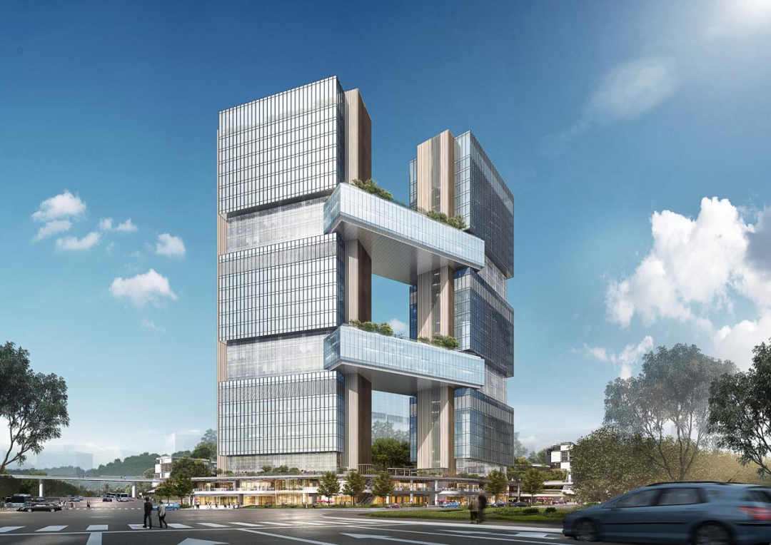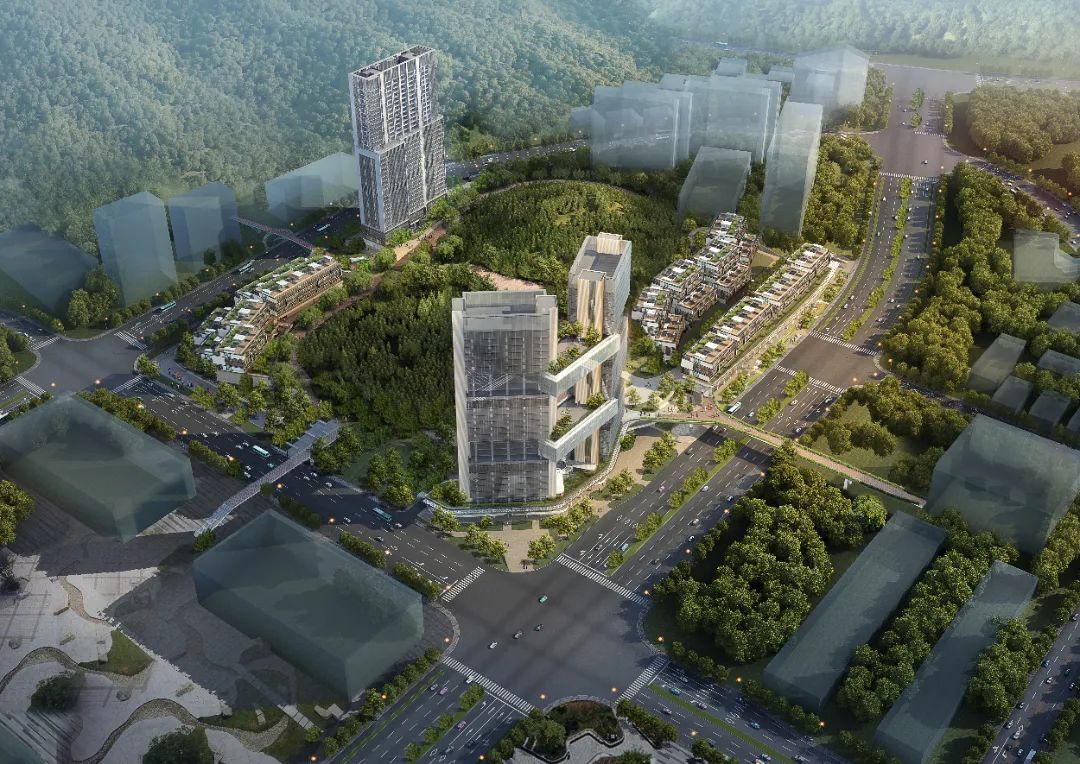该项目围绕环山岭公园而建,建筑面积约22万平方米,设计为双子塔,两塔之间使用钢结构连廊连接,规划高度约127米。